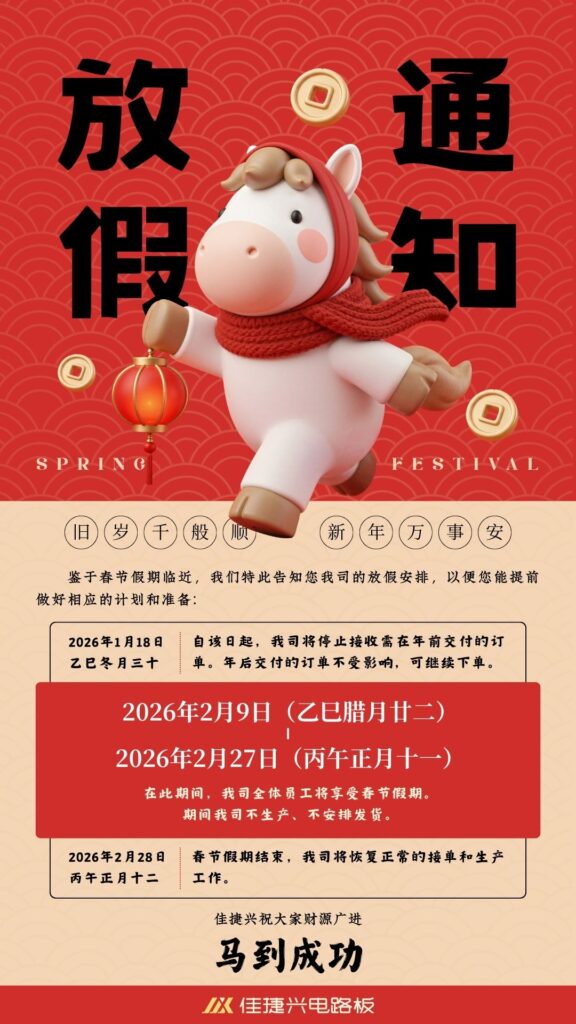 新春的脚步渐近,佳节的气氛渐浓。在这辞旧迎新的美好时刻,佳捷兴电路板全体同仁谨向您及您的团队致以最诚挚的问候与最美好的祝福!感谢您在过去一年里的信任、支持与相伴,您的每一次托付都是我们前进的动力。